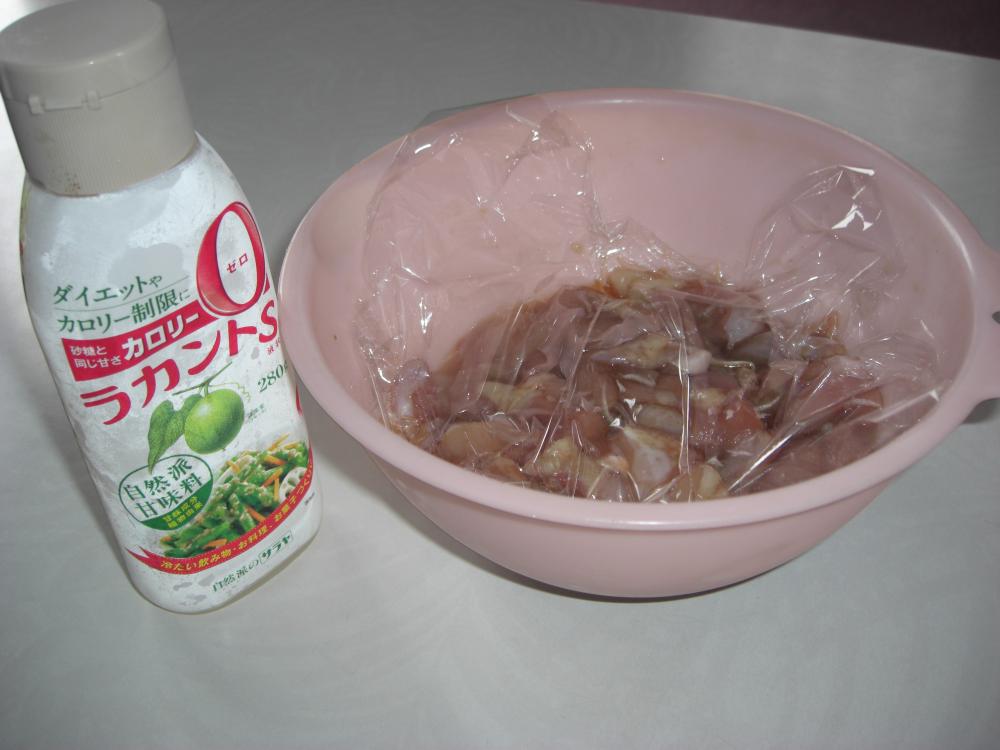 | 1 | 醤油、酒、ラカントS液状を使って鶏肉にした味をつける。 15分ぐらいでOK |
